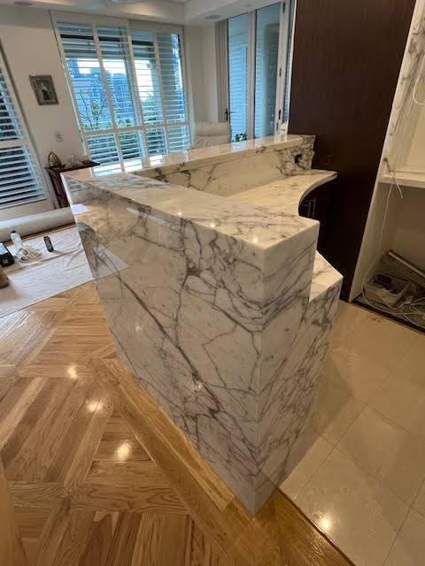 Client wanted to replace the original bar countertop surfaces in their penthouse with a more luxurious, polished marble finish.
